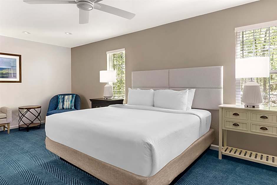 This suite features a plush king sized bed in master bedroom and a loft area with two twin beds. Enjoy a fully-equipped kitchen that provides all of comforts of a home and the convenience to make a meal. The entire family can enjoy this beautiful suite offering a separate living room with a 42’’ HD TV and DVD player. Suite also has a furnished patio. Can accommodate up to 6 guests.